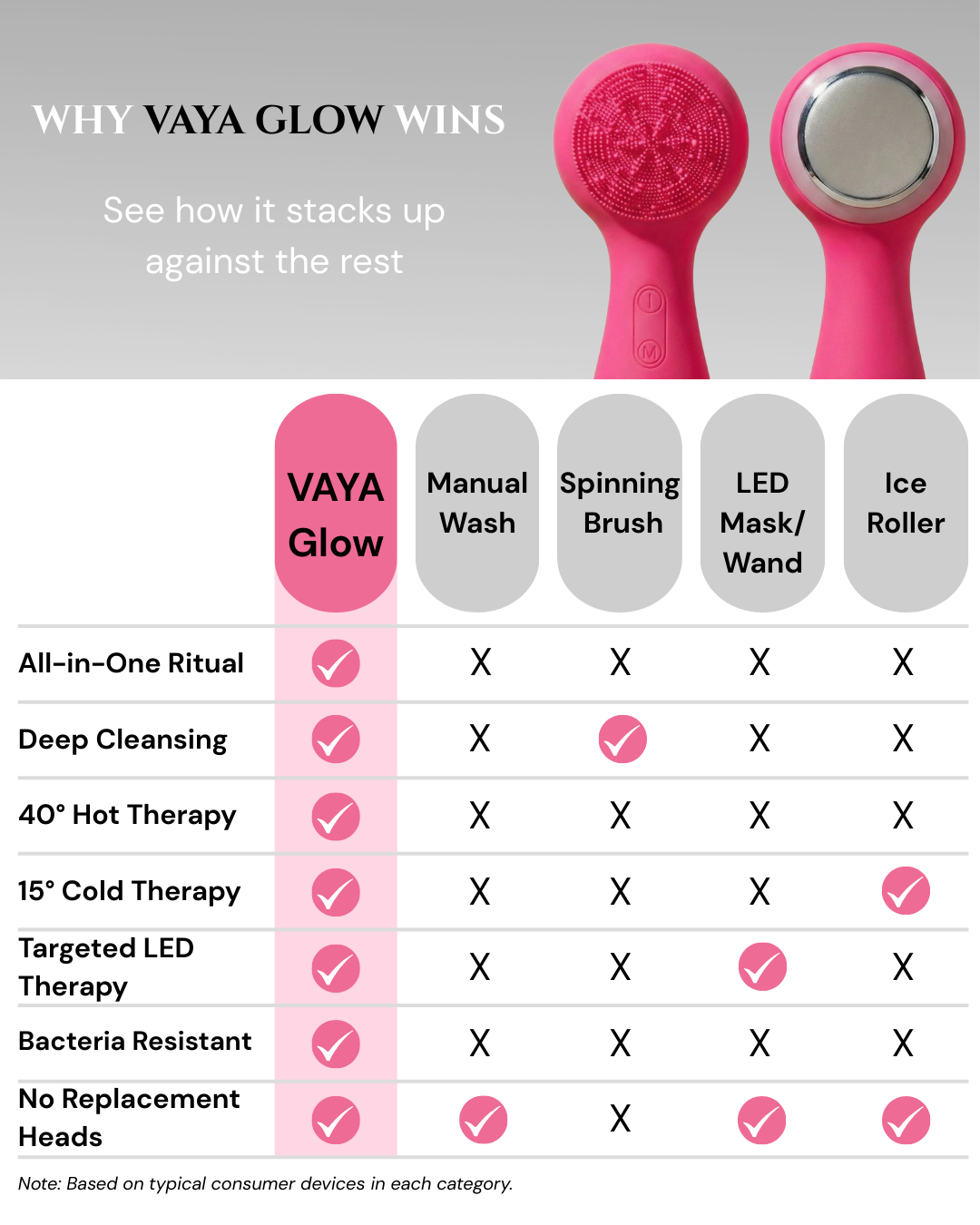 Most devices only cleanse, heat, or cool — but not all in one. VAYA Glow unites deep cleansing, hot and cold therapy, and LED light treatment in a single sleek, travel-friendly design. It’s your entire skincare ritual, refined into one effortless tool.